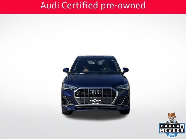 NAVIGATION GPS NAV, VERY RARE S LINE!!, ONE OWNER, CLEAN CARFAX...NO ACCIDENTS, RECENT HOFFMAN TRADE, SUNROOF MOONROOF, AUDI CERTIFIED, 10 Speakers, 4-Wheel Disc Brakes, ABS brakes, Air Conditioning, Alarm with Motion Sensor, Alloy wheels, AM/FM radio, Audi Advanced Key, Audi Beam-Rings, Audi Guard Protection Kit, Audi smartphone interface (Apple CarPlay/Android Auto), Auto High-beam Headlights, Auto-Dimming Power-Folding Exterior Mirrors, Auto-Dimming Rear-View Mirror, Automatic temperature control, Brake assist, Bumpers: body-color, Convenience Package, Delay-off headlights, Driver door bin, Driver Seat Memory, Driver vanity mirror, Dual front impact airbags, Dual front side impact airbags, Electronic Stability Control, Emergency communication system: Audi connect CARE, Exterior Parking Camera Rear, Four wheel independent suspension, Front anti-roll bar, Front Bucket Seats, Front Center Armrest, Front dual zone A/C, Front fog lights, Front reading lights, Fully automatic headlights, Garage Door Opener (HomeLink), Heated door mirrors, Heated Front Bucket Seats, Heated front seats, Illuminated entry, Knee airbag, Leather Seating Surfaces, Leather Shift Knob, Leather steering wheel, LED Interior Lighting Package, Low tire pressure warning, Occupant sensing airbag, Outside temperature display, Overhead airbag, Overhead console, Panic alarm, Passenger door bin, Passenger vanity mirror, Power door mirrors, Power driver seat, Power Liftgate, Power moonroof: Panoramic, Power passenger seat, Power steering, Power windows, Radio data system, Radio: Audi Sound System, Rain sensing wipers, Rear air conditioning, Rear anti-roll bar, Rear reading lights, Rear seat center armrest, Rear window defroster, Rear window wiper, Remote keyless entry, SiriusXM with 360L (3 Months Trial), Speed control, Speed-sensing steering, Split folding rear seat, Spoiler, Steering wheel mounted audio controls, Tachometer, Telescoping steering wheel, Tilt steering wheel, Traction control, Trip computer, Turn signal indicator mirrors, Variably intermittent wipers, Wheels: 18" 5-V-Spoke-S Design, Wireless Phone Charging Pad. CARFAX One-Owner. Clean CARFAX. Certified. Navarra Blue Metallic 2025 Audi Q3 Premium S Line quattro quattro 8-Speed Automatic with Tiptronic 2.0L 4-Cylinder TFSI