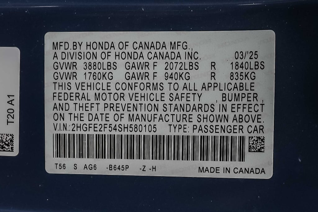 MOONROOF SUNROOF, REAR BACK UP CAMERA, BLUE TOOTH, APPLE CARPLAY / ANDROID AUTO, Black Artificial Leather. 2025 Honda Civic Sport Certified. Clean CARFAX. CARFAX One-Owner. 31/39 City/Highway MPG 31/39 City/Highway MPG