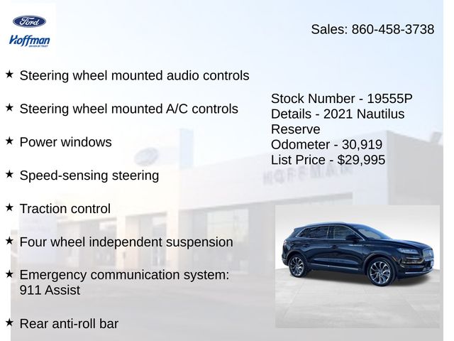 *New Tires*, *One Owner*, Nautilus Reserve, Infinite Black, 13 Speakers, 360 Degree Camera, 4-Wheel Disc Brakes, ABS brakes, Adaptive Cruise Control, Air Conditioning, AM/FM radio: SiriusXM with 360L, Auto High-beam Headlights, Auto tilt-away steering wheel, Auto-dimming Rear-View mirror, Automatic temperature control, Brake assist, Delay-off headlights, Distance Alert & Distance Indication, Driver door bin, Driver vanity mirror, Dual front impact airbags, Dual front side impact airbags, Electronic Stability Control, Emergency communication system: 911 Assist, Enhanced Active Park Assist, Equipment Group 200A, Evasive Steering Assist, Four wheel independent suspension, Front anti-roll bar, Front Bucket Seats, Front dual zone A/C, Front reading lights, Front Sensing, Fully automatic headlights, Garage door transmitter: HomeLink, Heated front seats, Heated rear seats, Heated steering wheel, Illuminated entry, Knee airbag, Leather steering wheel, Lincoln Co-Pilot360 Plus Package, Low tire pressure warning, Navigation System, Occupant sensing airbag, Outside temperature display, Overhead airbag, Overhead console, Passenger vanity mirror, Power driver seat, Power Liftgate, Power moonroof: Panoramic Vista Roof, Power passenger seat, Power steering, Power windows, Prem Lthr-Trimmed Heated/Ventilated Captain Seats, Radio data system, Radio: Revel AM/FM/HD Audio System, Rain sensing wipers, Rear anti-roll bar, Rear reading lights, Rear seat center armrest, Rear window defroster, Rear window wiper, Remote keyless entry, Speed-sensing steering, Speed-Sensitive Wipers, Split folding rear seat, Steering wheel memory, Steering wheel mounted A/C controls, Steering wheel mounted audio controls, SYNC 4 w/Enhanced Voice Recognition, Tachometer, Telescoping steering wheel, Tilt steering wheel, Traction control, Trip computer, Variably intermittent wipers, Ventilated front seats, Wheels: 20" Prem Painted Bright Machined Aluminum.