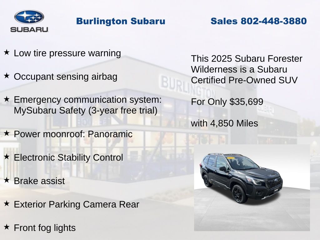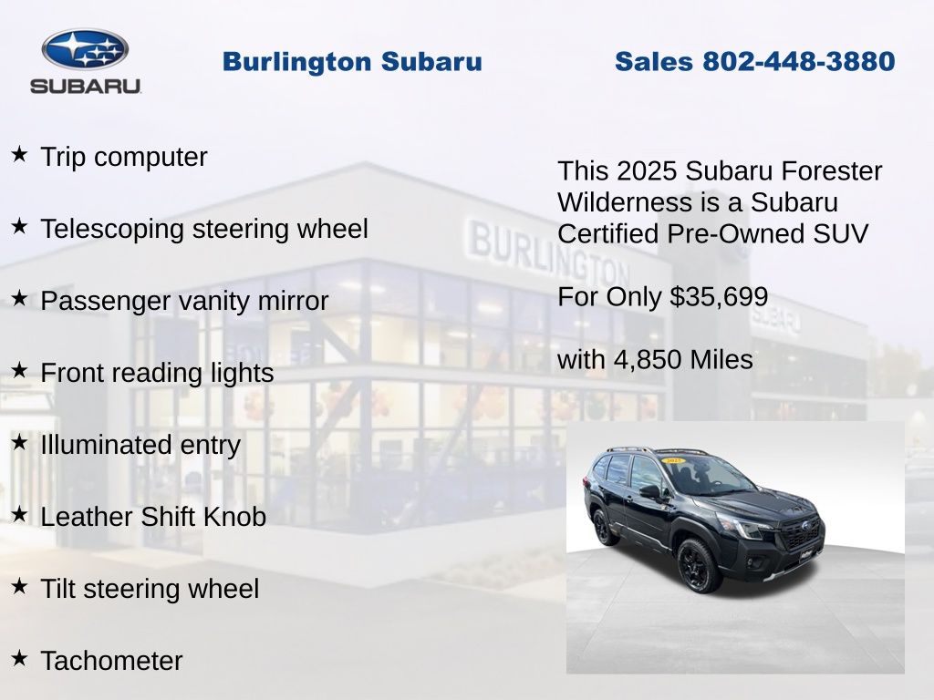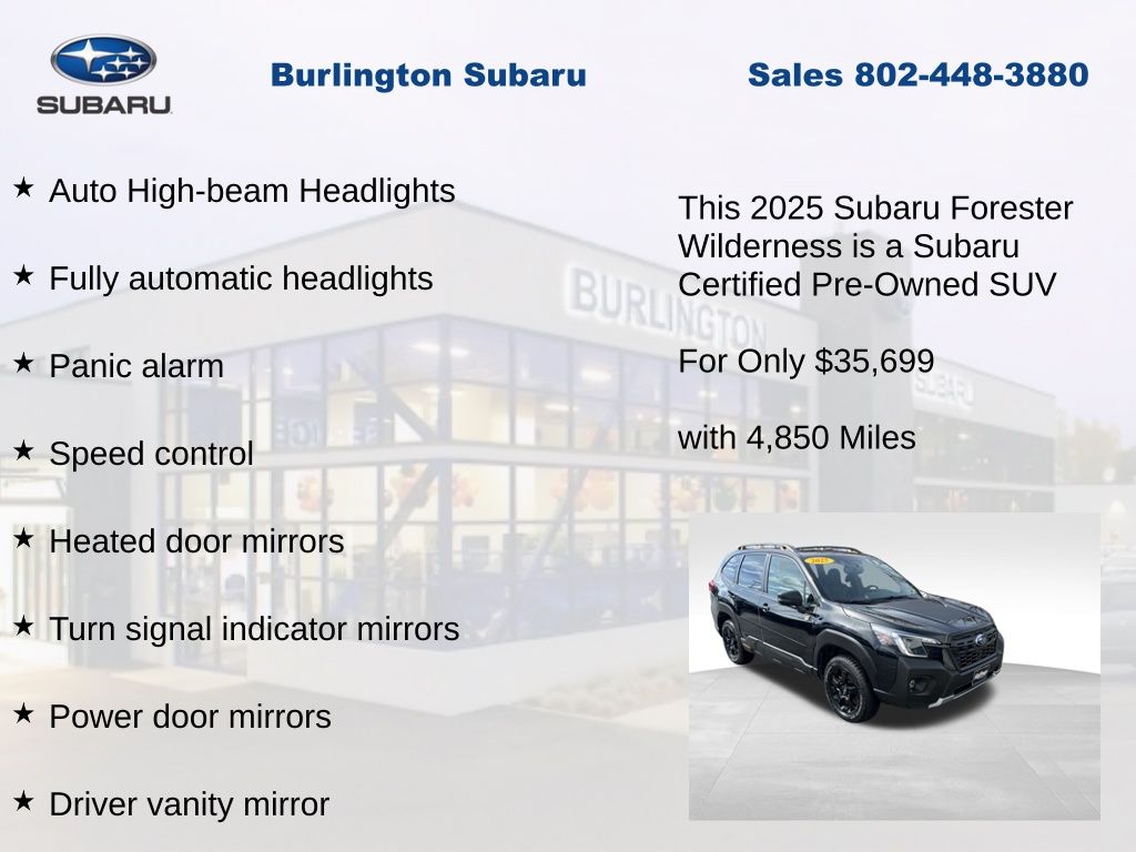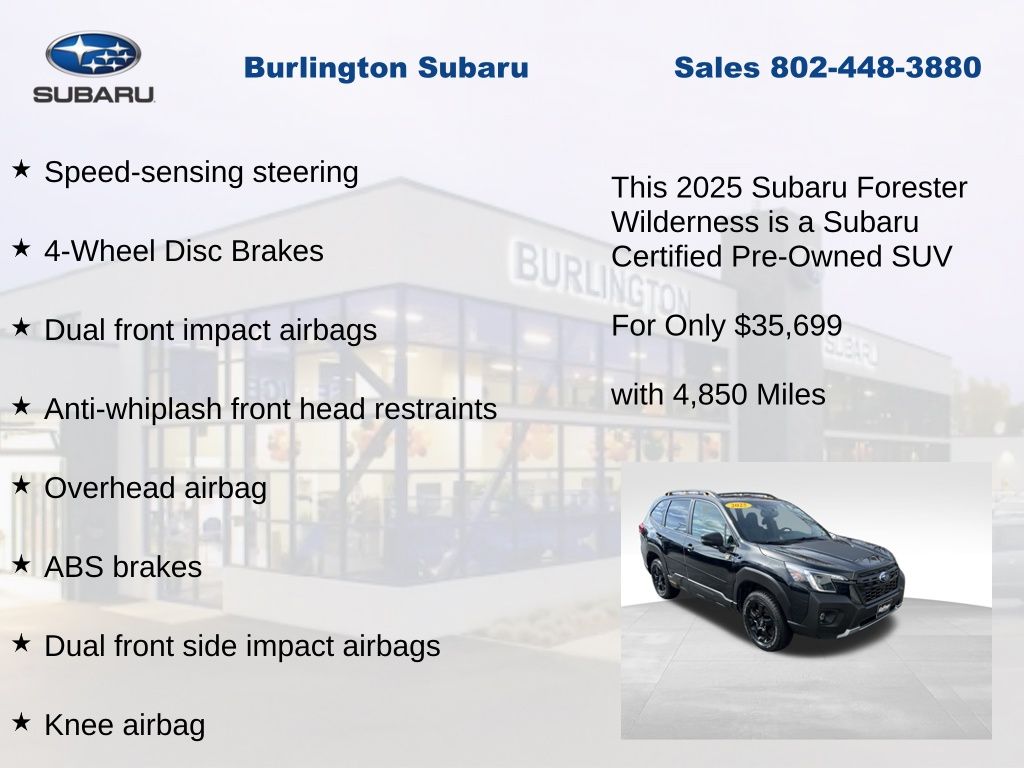 CARFAX One-Owner. Clean CARFAX. Subaru Forester Wilderness 2025 Certified. 4-Wheel Disc Brakes, ABS brakes, Air Conditioning, Alloy wheels, Anti-whiplash front head restraints, Auto High-beam Headlights, Automatic temperature control, Brake assist, Driver vanity mirror, Dual front impact airbags, Dual front side impact airbags, Electronic Stability Control, Emergency communication system: MySubaru Safety (3-year free trial), Exterior Parking Camera Rear, Four wheel independent suspension, Front dual zone A/C, Front fog lights, Front reading lights, Fully automatic headlights, harman/kardon Audio & Power Rear Gate, Heated door mirrors, Heated Front Bucket Seats, Illuminated entry, Knee airbag, Leather Shift Knob, Leather steering wheel, Low tire pressure warning, Occupant sensing airbag, Outside temperature display, Overhead airbag, Panic alarm, Passenger vanity mirror, Power door mirrors, Power driver seat, Power moonroof: Panoramic, Power Rear Gate, Power steering, Power windows, Radio: Subaru 8.0" Multimedia Navigation System, Rear window defroster, Rear window wiper, Remote keyless entry, Speed control, Speed-sensing steering, Split folding rear seat, Steering wheel mounted audio controls, Tachometer, Telescoping steering wheel, Textured StarTex Upholstery, Tilt steering wheel, Traction control, Trip computer, Turn signal indicator mirrors, Variably intermittent wipers.