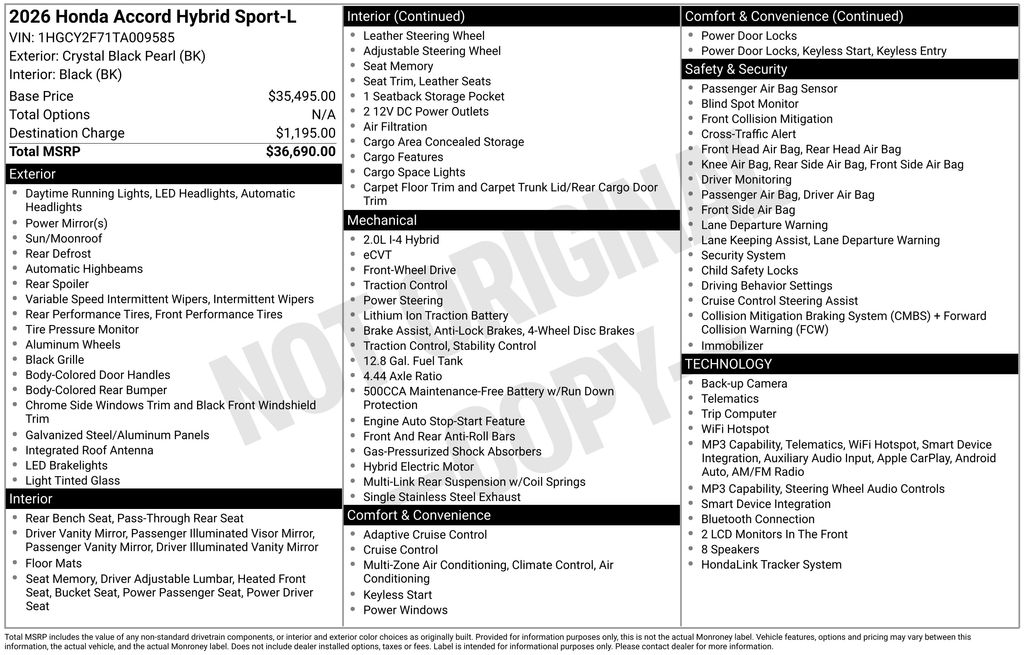 2.0L I4 DOHC 16V. 2026 Honda Accord Hybrid Sport-L Crystal Black Pearl FWD 46/41 City/Highway MPG