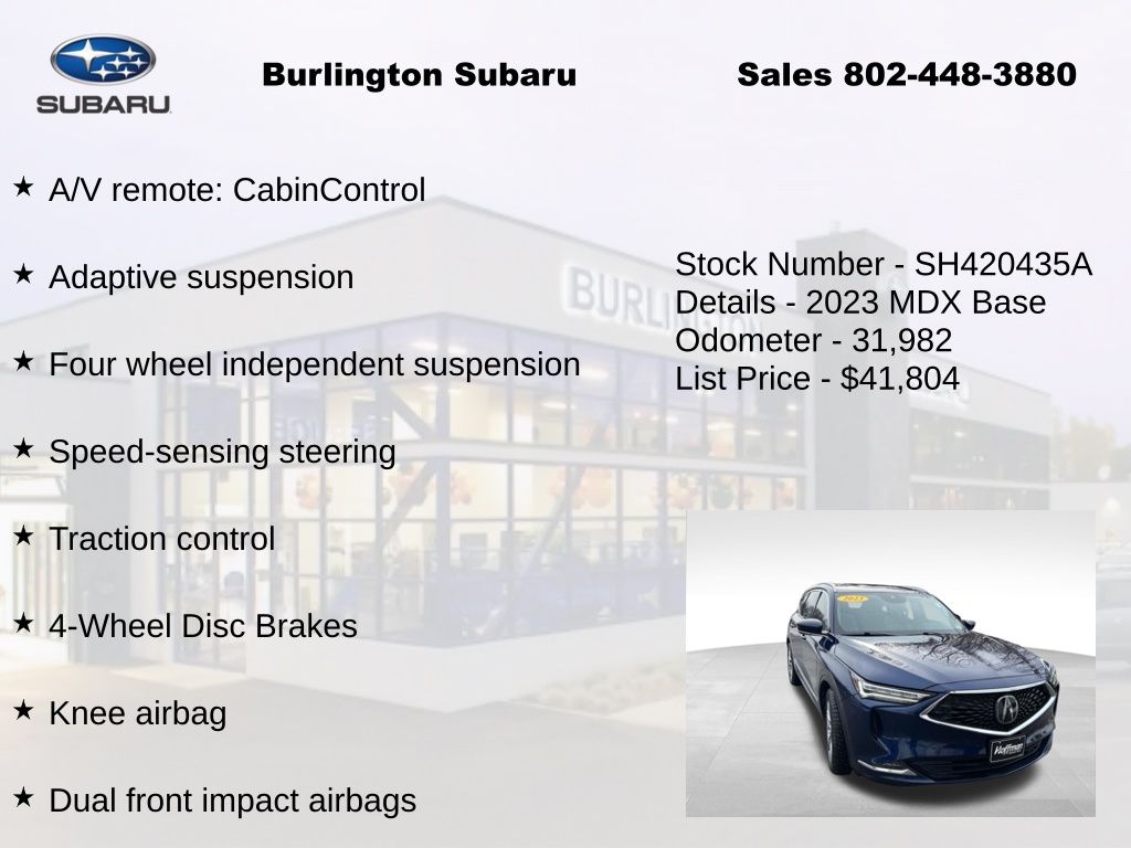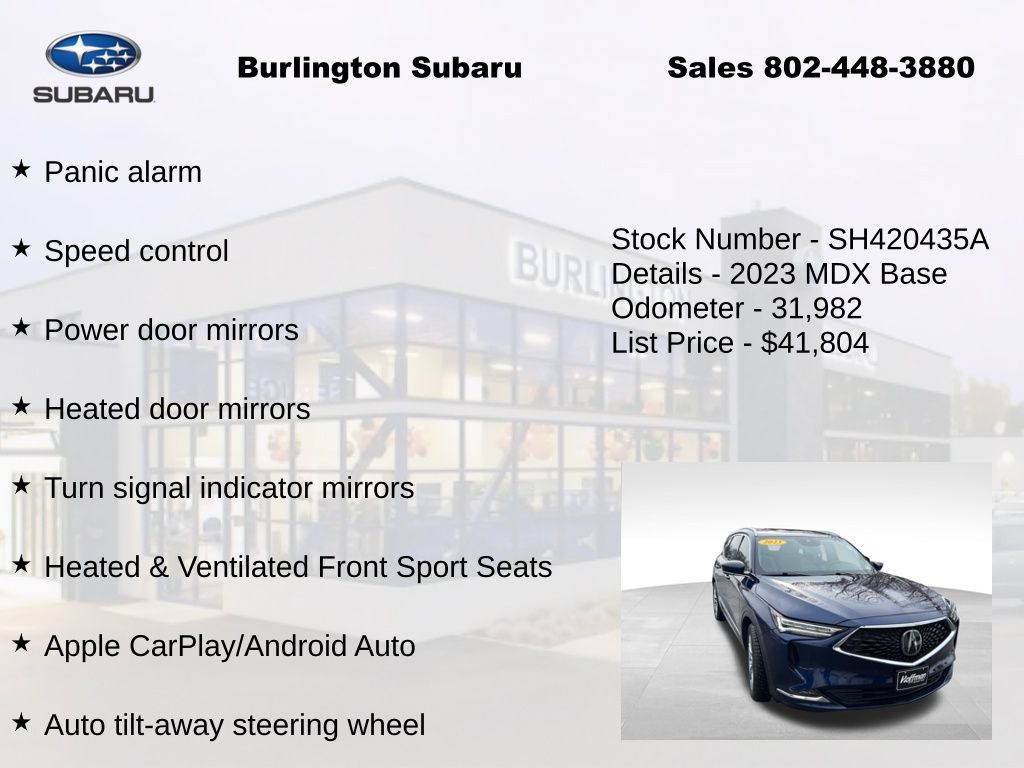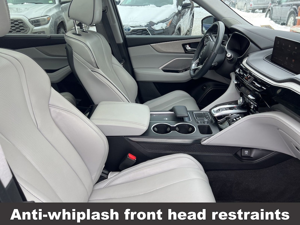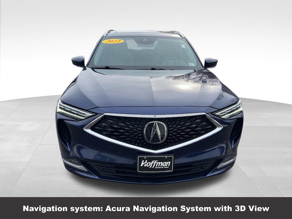 CARFAX One-Owner. Clean CARFAX. Acura MDX Advance 2023 3rd row seats: split-bench, 4-Wheel Disc Brakes, A/V remote: CabinControl, ABS brakes, Adaptive suspension, Air Conditioning, Alloy wheels, Anti-whiplash front head restraints, Apple CarPlay/Android Auto, Auto High-beam Headlights, Auto tilt-away steering wheel, Auto-dimming Rear-View mirror, Automatic temperature control, Brake assist, Compass, Delay-off headlights, Driver vanity mirror, Dual front impact airbags, Dual front side impact airbags, Electronic Stability Control, Emergency communication system: AcuraLink, Four wheel independent suspension, Front Bucket Seats, Front Center Armrest, Front dual zone A/C, Front fog lights, Front reading lights, Fully automatic headlights, Garage door transmitter: HomeLink, Heads-Up Display, Heated & Ventilated Front Sport Seats, Heated door mirrors, Heated front seats, Heated rear seats, Heated steering wheel, HVAC memory, Illuminated entry, Knee airbag, Lane departure: Lane Keeping Assist System (LKAS) active, Leather steering wheel, Low tire pressure warning, Memory seat, Navigation system: Acura Navigation System with 3D View, Occupant sensing airbag, Outside temperature display, Overhead airbag, Overhead console, Panic alarm, Passenger vanity mirror, Perforated Premium Milano Leather Trimmed Seats, Power door mirrors, Power driver seat, Power Liftgate, Power moonroof, Power passenger seat, Power steering, Power windows, Premium audio system: Acura/ELS Studio 3D, Rain sensing wipers, Rear air conditioning, Rear reading lights, Rear seat center armrest, Rear window defroster, Rear window wiper, Remote keyless entry, Speed control, Speed-sensing steering, Speed-Sensitive Wipers, Split folding rear seat, Steering wheel memory, Steering wheel mounted audio controls, Tachometer, Telescoping steering wheel, Tilt steering wheel, Traction control, Trip computer, Turn signal indicator mirrors, Variably intermittent wipers, Ventilated front seats. Odometer is 10341 miles below market average!