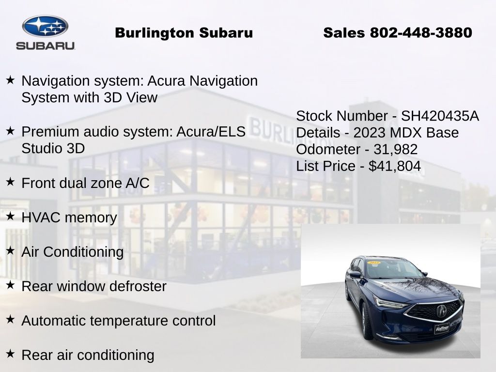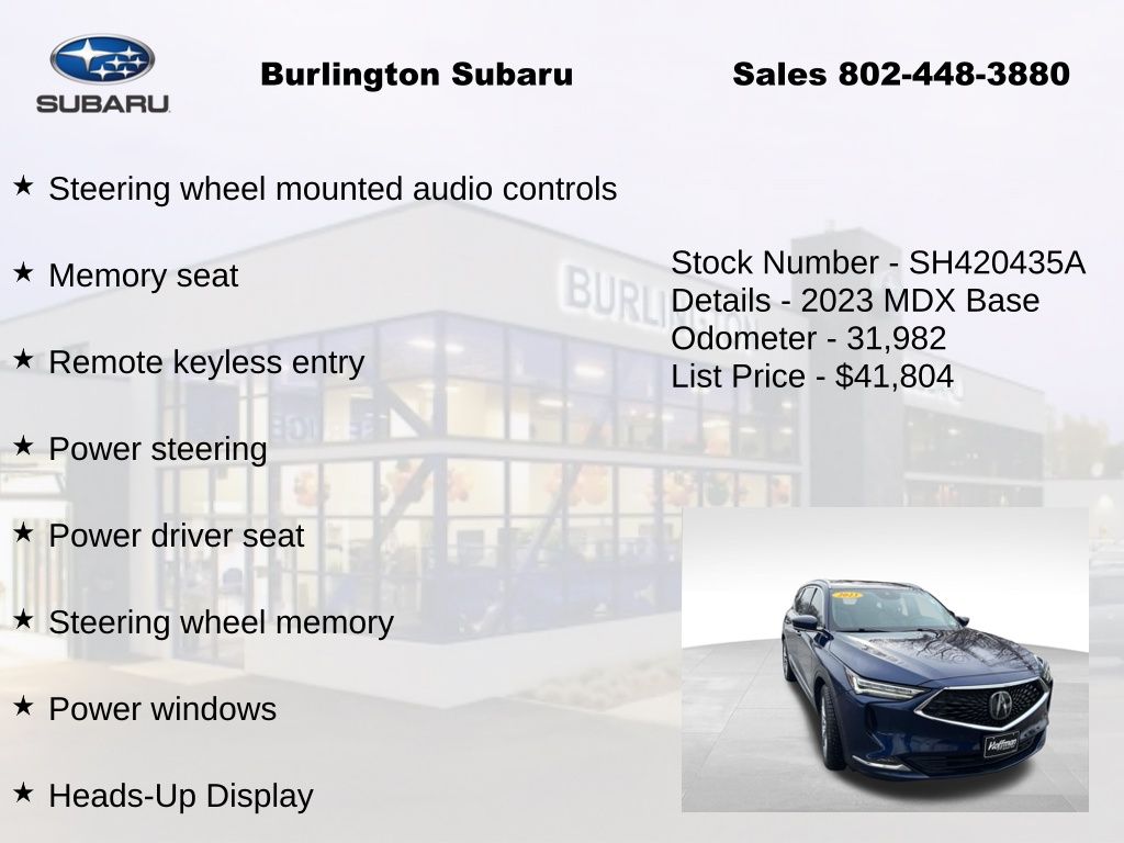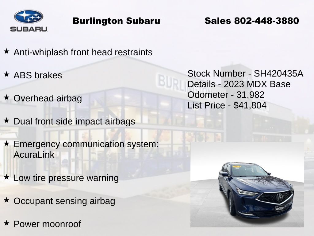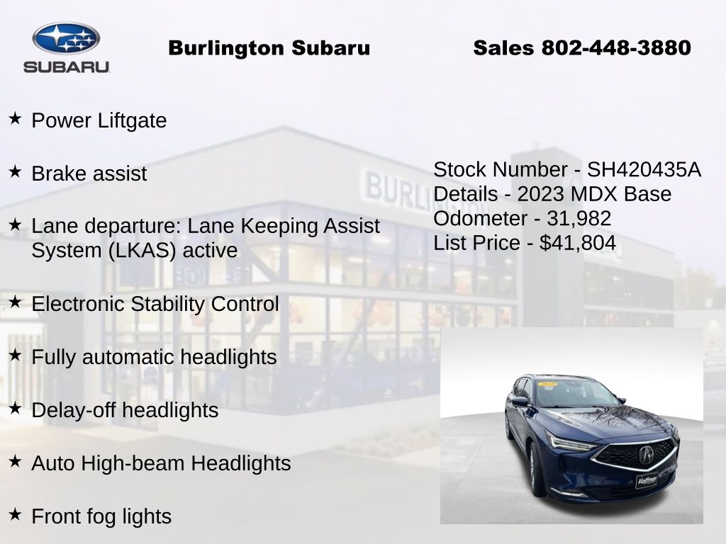 CARFAX One-Owner. Clean CARFAX. Acura MDX Advance 2023 3rd row seats: split-bench, 4-Wheel Disc Brakes, A/V remote: CabinControl, ABS brakes, Adaptive suspension, Air Conditioning, Alloy wheels, Anti-whiplash front head restraints, Apple CarPlay/Android Auto, Auto High-beam Headlights, Auto tilt-away steering wheel, Auto-dimming Rear-View mirror, Automatic temperature control, Brake assist, Compass, Delay-off headlights, Driver vanity mirror, Dual front impact airbags, Dual front side impact airbags, Electronic Stability Control, Emergency communication system: AcuraLink, Four wheel independent suspension, Front Bucket Seats, Front Center Armrest, Front dual zone A/C, Front fog lights, Front reading lights, Fully automatic headlights, Garage door transmitter: HomeLink, Heads-Up Display, Heated & Ventilated Front Sport Seats, Heated door mirrors, Heated front seats, Heated rear seats, Heated steering wheel, HVAC memory, Illuminated entry, Knee airbag, Lane departure: Lane Keeping Assist System (LKAS) active, Leather steering wheel, Low tire pressure warning, Memory seat, Navigation system: Acura Navigation System with 3D View, Occupant sensing airbag, Outside temperature display, Overhead airbag, Overhead console, Panic alarm, Passenger vanity mirror, Perforated Premium Milano Leather Trimmed Seats, Power door mirrors, Power driver seat, Power Liftgate, Power moonroof, Power passenger seat, Power steering, Power windows, Premium audio system: Acura/ELS Studio 3D, Rain sensing wipers, Rear air conditioning, Rear reading lights, Rear seat center armrest, Rear window defroster, Rear window wiper, Remote keyless entry, Speed control, Speed-sensing steering, Speed-Sensitive Wipers, Split folding rear seat, Steering wheel memory, Steering wheel mounted audio controls, Tachometer, Telescoping steering wheel, Tilt steering wheel, Traction control, Trip computer, Turn signal indicator mirrors, Variably intermittent wipers, Ventilated front seats. Odometer is 10341 miles below market average!