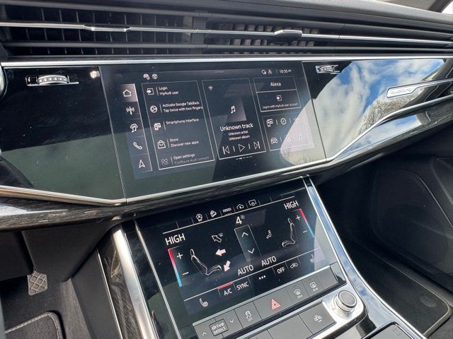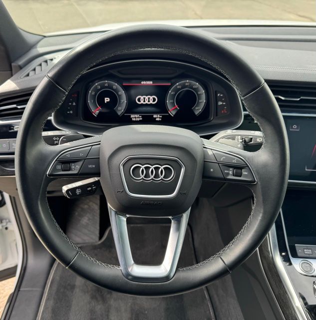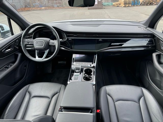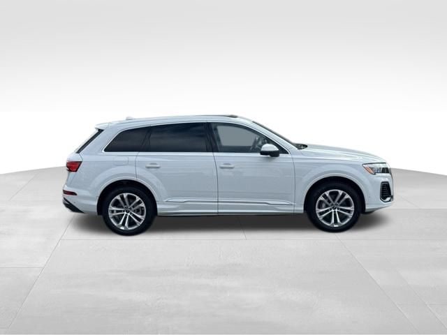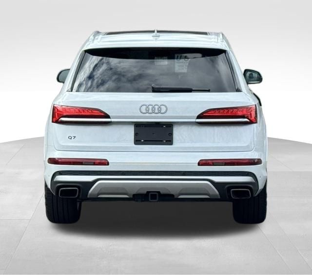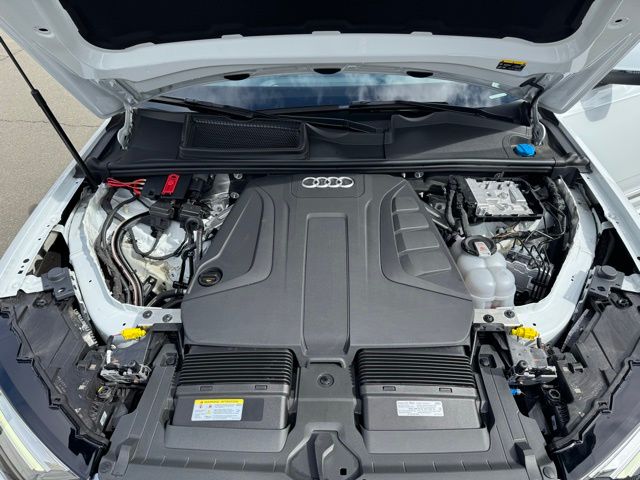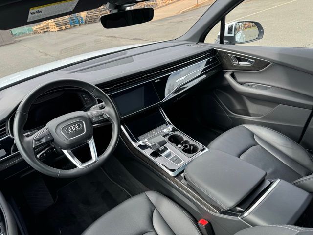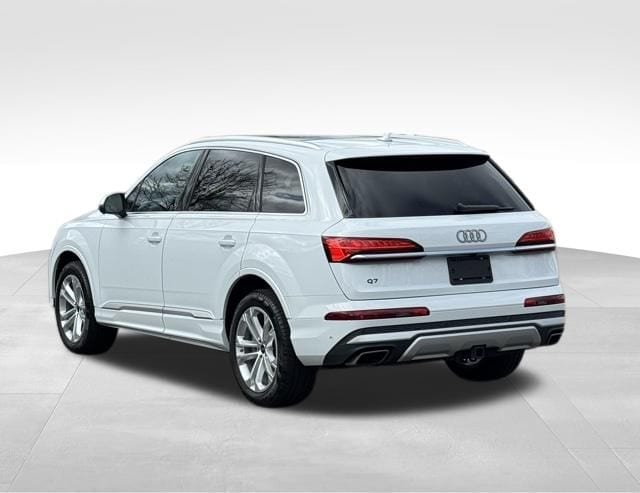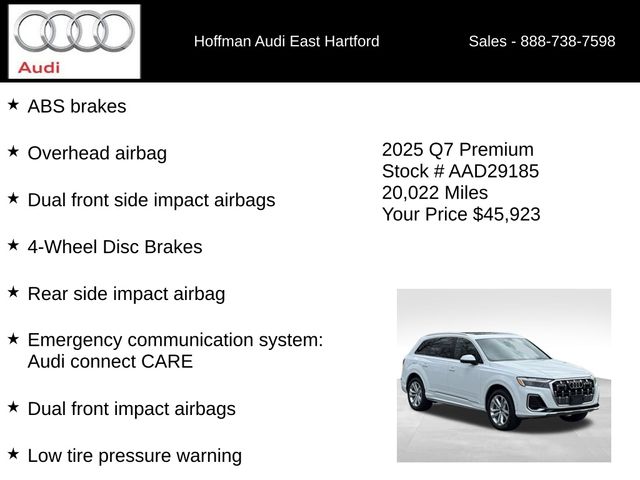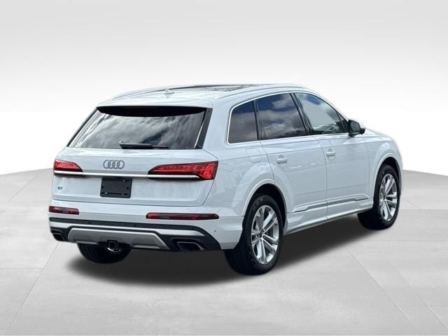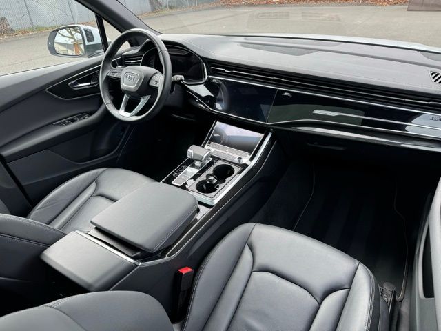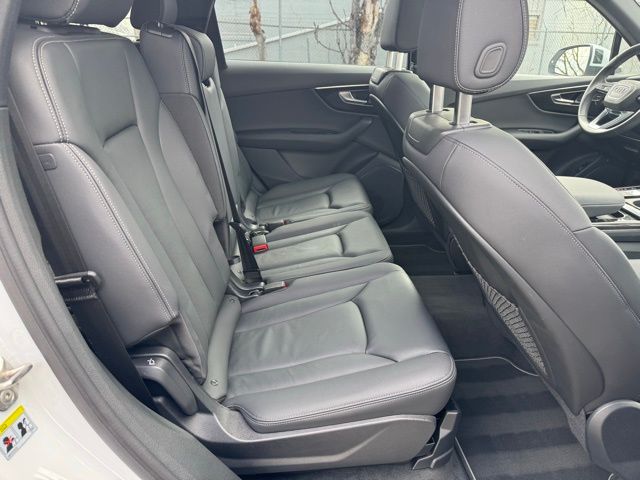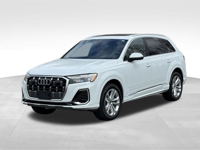 ONE OWNER, CLEAN CARFAX...NO ACCIDENTS, SUNROOF MOONROOF, REMAINDER OF FACTORY WARRANTY, INCLUDES WARRANTY, 6 MONTHS/6000 MILES POWERTRAIN WARRANTY, 10 Speakers, 3rd row seats: bench, 4-Wheel Disc Brakes, 7-Pin Adapter, ABS brakes, Air Conditioning, Alloy wheels, AM/FM radio: SiriusXM w/360L, Audi Beam Rings, Audi Guard Protection Kit, Auto High-beam Headlights, Auto-dimming door mirrors, Auto-dimming Rear-View mirror, Automatic temperature control, Brake assist, Bumpers: body-color, Compass, Convenience Package, Delay-off headlights, Driver door bin, Driver vanity mirror, Dual front impact airbags, Dual front side impact airbags, Electronic Stability Control, Emergency communication system: Audi connect CARE, Exterior Parking Camera Rear, Four wheel independent suspension, Front anti-roll bar, Front Bucket Seats, Front Center Armrest, Front dual zone A/C, Front fog lights, Front reading lights, Fully automatic headlights, Garage door transmitter: HomeLink, Genuine wood door panel insert, Heated door mirrors, Heated Front Bucket Seats, Heated front seats, Heated Steering Wheel, Illuminated entry, Leather Seating Surfaces, Leather Shift Knob, Leather steering wheel, Low tire pressure warning, Memory seat, Navigation system: Audi MMI Navigation plus with Touch Response, Occupant sensing airbag, Outside temperature display, Overhead airbag, Overhead console, Panic alarm, Passenger door bin, Passenger vanity mirror, Power door mirrors, Power driver seat, Power Liftgate, Power moonroof: Panoramic, Power passenger seat, Power steering, Power windows, Privacy Trunk Cover, Radio data system, Radio: Audi Sound System, Rain sensing wipers, Rear air conditioning, Rear anti-roll bar, Rear fog lights, Rear reading lights, Rear seat center armrest, Rear side impact airbag, Rear window defroster, Rear window wiper, Reclining 3rd row seat, Remote keyless entry, Security system, Speed control, Speed-sensing steering, Split folding rear seat, Spoiler, Steering wheel memory, Steering wheel mounted audio controls, Tachometer, Telescoping steering wheel, Tilt steering wheel, Top View Camera System, Traction control, Trailer Hitch, Trip computer, Turn signal indicator mirrors, Variably intermittent wipers, Wheels: 19" 5-Arm-Star Design, Wheels: 20" 5-Double-Spoke, Wireless Phone Charging Pad. CARFAX One-Owner. Glacier White 2025 Audi Q7 45 Premium quattro quattro 8-Speed Automatic with Tiptronic 2.0L 4-Cylinder TFSI