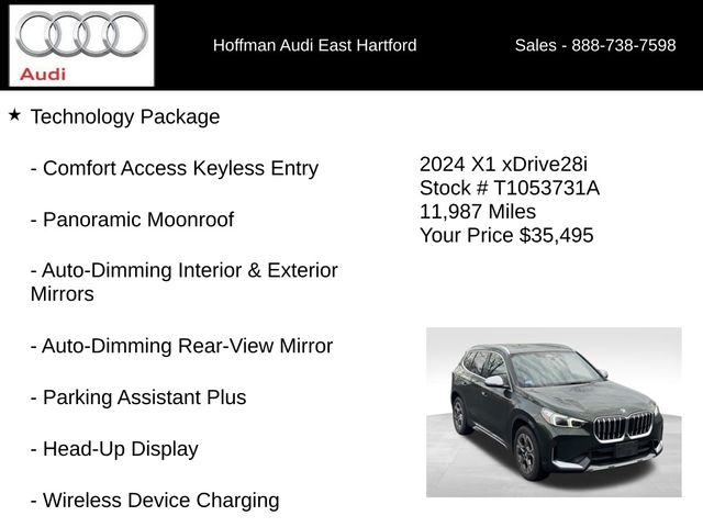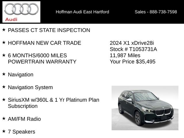 NAVIGATION GPS NAV, ONE OWNER, CLEAN CARFAX...NO ACCIDENTS, PASSES CT STATE INSPECTION, HOFFMAN NEW CAR TRADE, 6 MONTHS/6000 MILES POWERTRAIN WARRANTY, 3.20 Axle Ratio, 4-Wheel Disc Brakes, 7 Speakers, ABS brakes, Air Conditioning, Alloy wheels, AM/FM Radio, AM/FM radio: SiriusXM with 360L, Anti Theft Recorder, Apple CarPlay & Android Auto Compatibility, Apple CarPlay Compatibility, Auto High-beam Headlights, Auto-Dimming Interior & Exterior Mirrors, Auto-Dimming Rear-View Mirror, Automatic temperature control, Black High Gloss Trim w/Ambient Light, BMW Assist eCall, BMW Digital Key Plus w/UWB, BMW TeleServices, Brake assist, Bumpers: body-color, Comfort Access Keyless Entry, Compass, ConnectedDrive Services, Delay-off headlights, Driver door bin, Driver vanity mirror, Dual front impact airbags, Dual front side impact airbags, Electronic Stability Control, Emergency communication system: BMW Assist eCall, Exterior Parking Camera Rear, Four wheel independent suspension, Front anti-roll bar, Front Bucket Seats, Front Center Armrest w/Storage, Front dual zone A/C, Front reading lights, Head-Up Display, Heated door mirrors, Heated Front Seats, Heated Front Seats & Steering Wheel, Heated Steering Wheel, Illuminated entry, Knee airbag, Live Cockpit Pro, Low tire pressure warning, Memory seat, Navigation, Navigation System, Occupant sensing airbag, Outside temperature display, Overhead airbag, Panic alarm, Panoramic Moonroof, Parking Assistant Plus, Passenger door bin, Passenger vanity mirror, Perforated Veganza Upholstery, Power door mirrors, Power driver seat, Power Front Seats, Power Liftgate, Power passenger seat, Power steering, Power windows, Premium Content 1, Radio data system, Rain sensing wipers, Rear anti-roll bar, Rear reading lights, Rear seat center armrest, Rear window defroster, Rear window wiper, Remote Engine Start, Remote keyless entry, Roof rack: xxxxxx, Security system, SiriusXM w/360L & 1 Yr Platinum Plan Subscription, Speed control, Speed-sensing steering, Speed-Sensitive Wipers, Split folding rear seat, Spoiler, Sport Seats, Sport steering wheel, Steering wheel mounted audio controls, Surround View w/3D View, Tachometer, Technology Package, Telescoping steering wheel, Tilt steering wheel, Traction control, Trip computer, Turn signal indicator mirrors, Variably intermittent wipers, Wheels: 18" x 7.5" V Spoke Bi-Color, Widescreen Display, Wireless Device Charging. CARFAX One-Owner. Clean CARFAX. San Remo Green Metallic 2024 BMW X1 xDrive28i AWD 7-Speed Automatic 2.0L 4-Cylinder DOHC 16V TwinPower Turbo