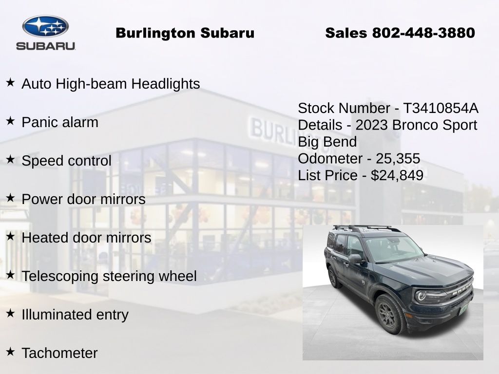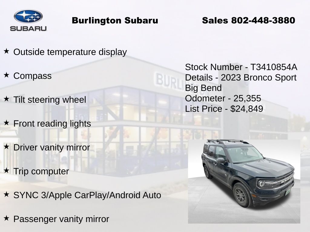 CARFAX One-Owner. Ford Bronco Sport Big Bend 2023 4-Wheel Disc Brakes, ABS brakes, Air Conditioning, Alloy wheels, Auto High-beam Headlights, Automatic temperature control, Brake assist, Compass, Delay-off headlights, Driver vanity mirror, Dual front impact airbags, Dual front side impact airbags, Electronic Stability Control, Emergency communication system: SYNC 3 911 Assist, Four wheel independent suspension, Front reading lights, Fully automatic headlights, Heated door mirrors, Illuminated entry, Knee airbag, Low tire pressure warning, Occupant sensing airbag, Outside temperature display, Overhead airbag, Panic alarm, Passenger vanity mirror, Power door mirrors, Power steering, Power windows, Rear reading lights, Rear window defroster, Rear window wiper, Remote keyless entry, Speed control, Speed-sensing steering, Speed-Sensitive Wipers, Split folding rear seat, Steering wheel mounted audio controls, SYNC 3 Communications & Entertainment System, SYNC 3/Apple CarPlay/Android Auto, Tachometer, Telescoping steering wheel, Tilt steering wheel, Traction control, Trip computer, Variably intermittent wipers. Odometer is 6326 miles below market average!