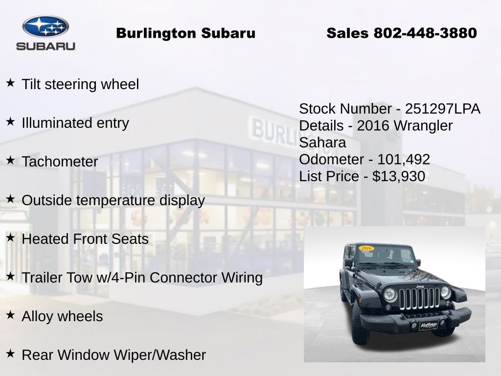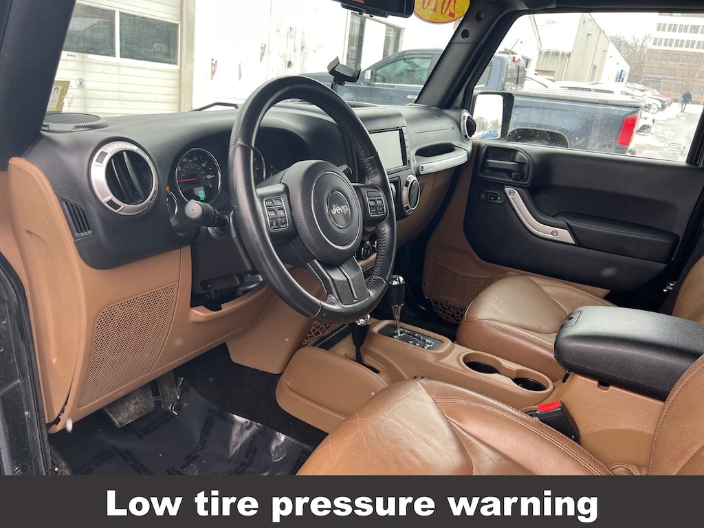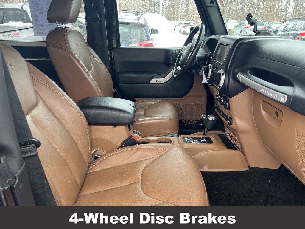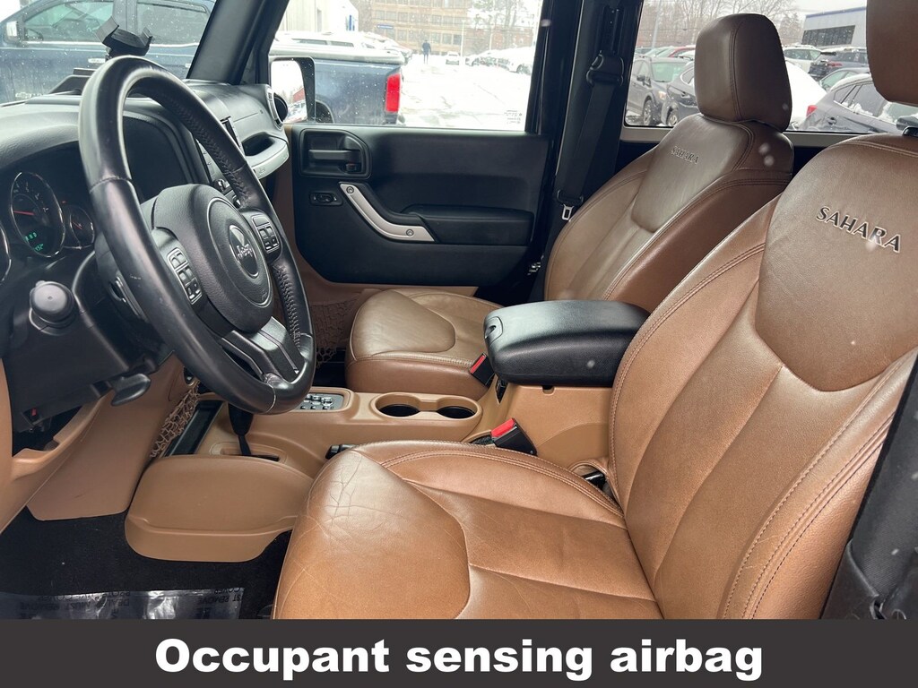 Clean CARFAX. Jeep Wrangler Sahara 2016 4-Wheel Disc Brakes, 6.5" Touchscreen Display, ABS brakes, Air Conditioning w/Auto Temperature Control, Air Filtering, Alloy wheels, AM/FM radio: SiriusXM, Anti-Spin Differential Rear Axle, Auto-dimming Rear-View mirror, Brake assist, CD player, Compass, Dual front impact airbags, Electronic Stability Control, Freedom Top Hard Top Headliner, Front fog lights, Front reading lights, Fully automatic headlights, GPS Navigation, Heated door mirrors, Heated Front Seats, Heavy Duty Suspension w/Gas Shocks, Humidity Sensor, Illuminated entry, Integrated roll-over protection, Leather Wrapped Steering Wheel, Low tire pressure warning, Occupant sensing airbag, Outside temperature display, Panic alarm, Passenger vanity mirror, Power door mirrors, Power steering, Power windows, Rear Window Defroster, Rear Window Wiper/Washer, Remote keyless entry, SiriusXM Travel Link, Speed control, Steering wheel mounted audio controls, Tachometer, Tilt steering wheel, Tire Pressure Monitoring Display, Traction control, Trailer Tow w/4-Pin Connector Wiring, Trip computer, Uconnect Voice Command w/Bluetooth, Variably intermittent wipers, Vehicle Information Center.