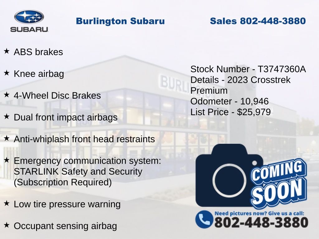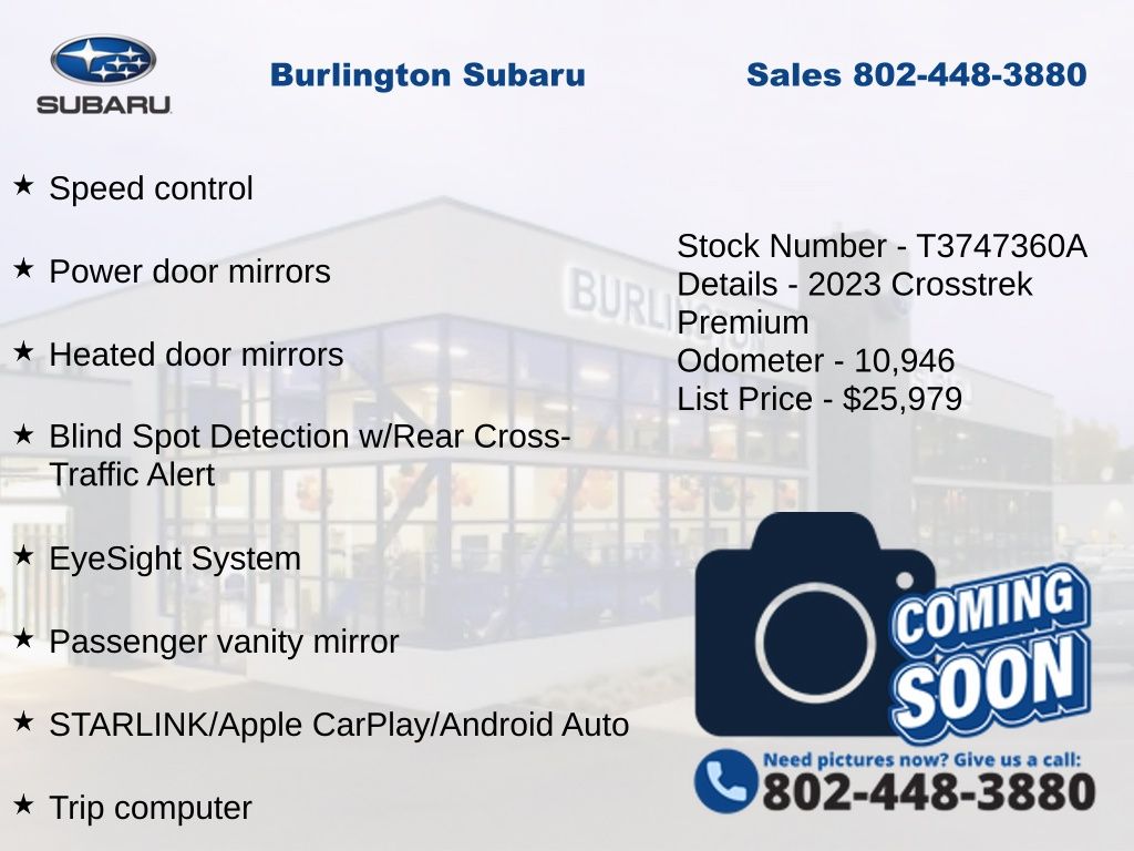 CARFAX One-Owner. Clean CARFAX. Subaru Crosstrek Premium 2023 4-Wheel Disc Brakes, 6-Way Power Driver's Seat, ABS brakes, Air Conditioning, Alloy wheels, AM/FM radio: SiriusXM, Anti-whiplash front head restraints, Automatic temperature control, Blind Spot Detection w/Rear Cross-Traffic Alert, Brake assist, CD player, Driver vanity mirror, Dual front impact airbags, Dual front side impact airbags, Electronic Stability Control, Emergency communication system: STARLINK Safety and Security (Subscription Required), Exterior Parking Camera Rear, EyeSight System, Four wheel independent suspension, Front fog lights, Front reading lights, Fully automatic headlights, Heated door mirrors, Heated Front Bucket Seats, Illuminated entry, Keyless Access w/Push-Button Start, Knee airbag, Leather Shift Knob, Low tire pressure warning, Moonroof & BSD w/RCTA & Power Driver Seat, Occupant sensing airbag, Outside temperature display, Overhead airbag, Panic alarm, Passenger vanity mirror, Power door mirrors, Power Moonroof, Power steering, Power windows, Rear window defroster, Rear window wiper, Remote keyless entry, Speed control, Speed-sensing steering, Split folding rear seat, STARLINK/Apple CarPlay/Android Auto, Steering wheel mounted audio controls, Tachometer, Telescoping steering wheel, Tilt steering wheel, Traction control, Trip computer, Variably intermittent wipers. Odometer is 25627 miles below market average!