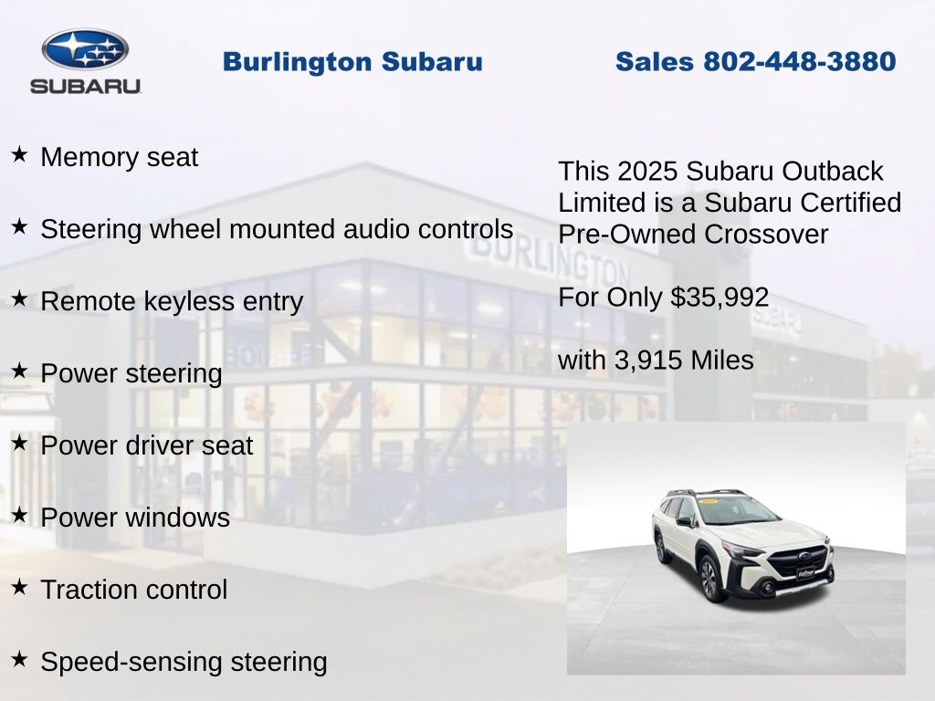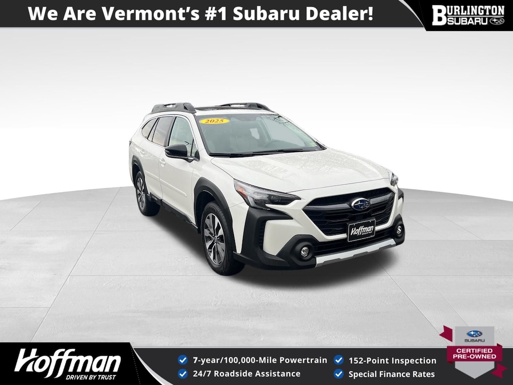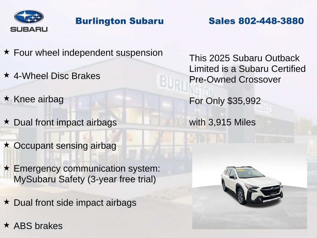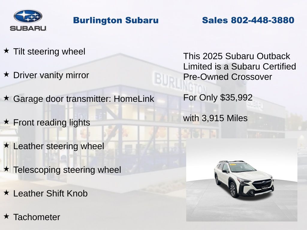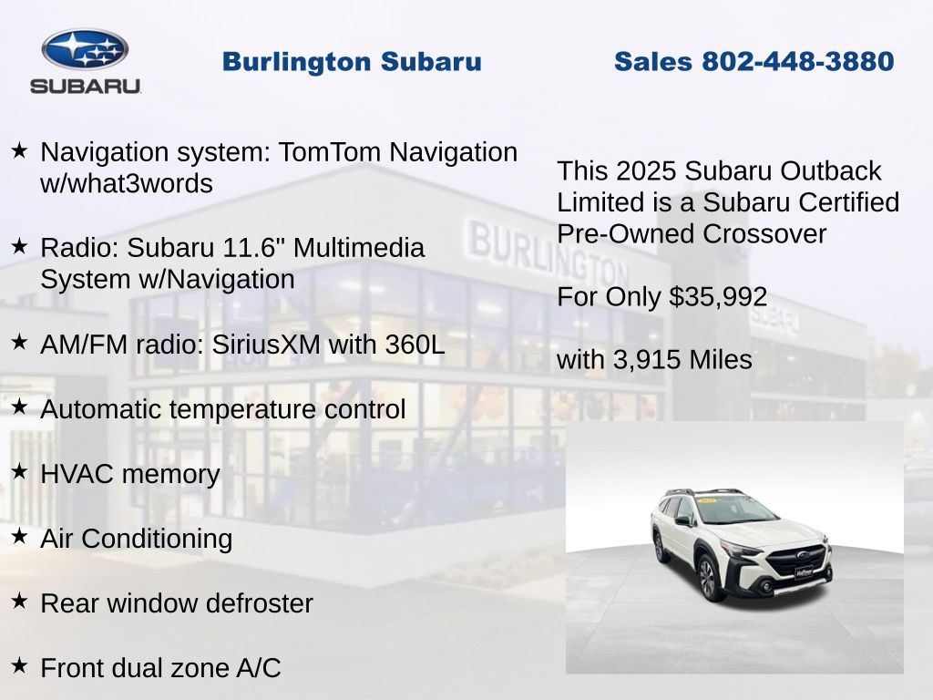 Clean CARFAX. Subaru Outback Limited 2025 Certified. 4-Wheel Disc Brakes, ABS brakes, Air Conditioning, Alloy wheels, AM/FM radio: SiriusXM with 360L, Apple CarPlay & Android Auto, Auto High-beam Headlights, Auto-dimming Rear-View mirror, Automatic temperature control, Brake assist, Compass, Driver vanity mirror, Dual front impact airbags, Dual front side impact airbags, Electronic Stability Control, Emergency communication system: MySubaru Safety (3-year free trial), Exterior Parking Camera Rear, Four wheel independent suspension, Front dual zone A/C, Front fog lights, Front reading lights, Fully automatic headlights, Garage door transmitter: HomeLink, Heated door mirrors, Heated Front Bucket Seats, Heated steering wheel, HVAC memory, Illuminated entry, Knee airbag, Leather Shift Knob, Leather steering wheel, Low tire pressure warning, Memory seat, Navigation system: TomTom Navigation w/what3words, Occupant sensing airbag, Outside temperature display, Overhead airbag, Panic alarm, Passenger vanity mirror, Perforated Leather-Trimmed Upholstery, Power driver seat, Power Liftgate, Power moonroof, Power passenger seat, Power steering, Power windows, Radio: Subaru 11.6" Multimedia System w/Navigation, Rear window defroster, Rear window wiper, Remote keyless entry, Speed control, Speed-sensing steering, Split folding rear seat, Steering wheel mounted audio controls, Tachometer, Telescoping steering wheel, Tilt steering wheel, Traction control, Trip computer, Turn signal indicator mirrors, Variably intermittent wipers. Odometer is 2898 miles below market average!