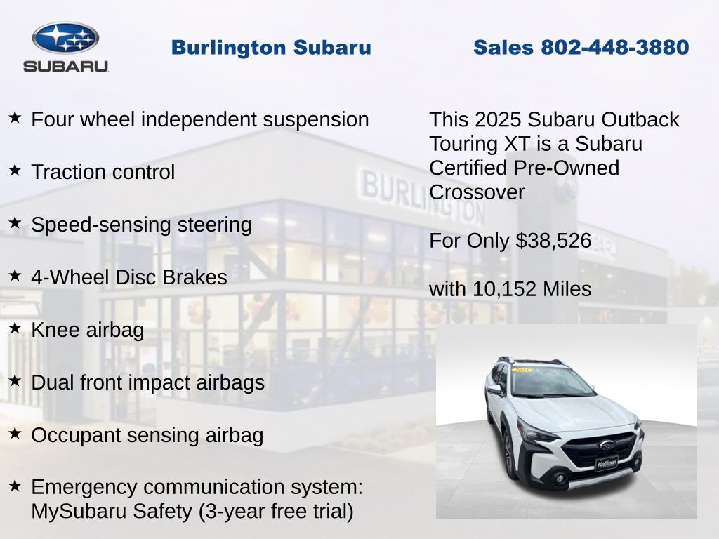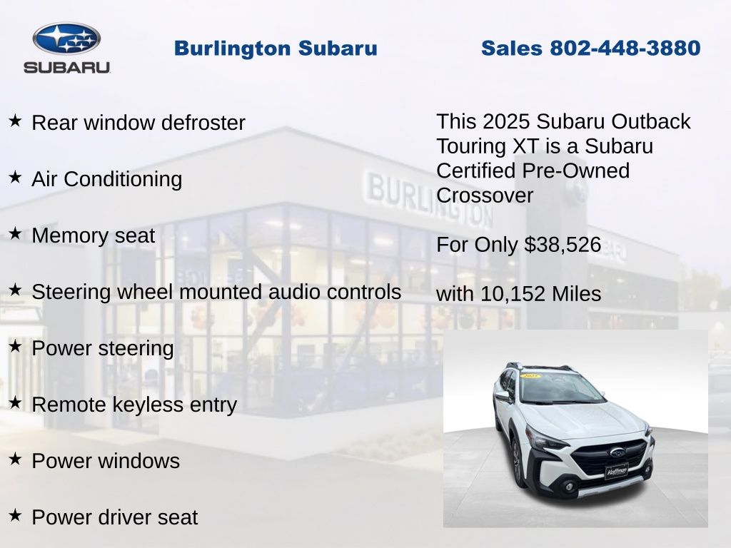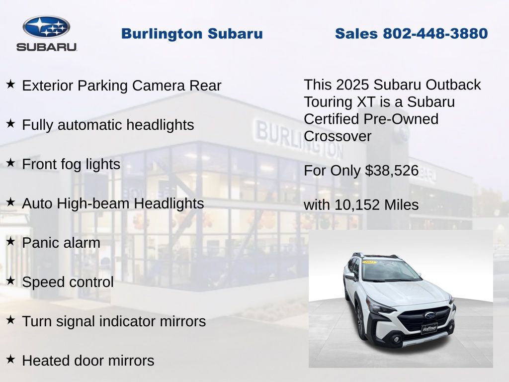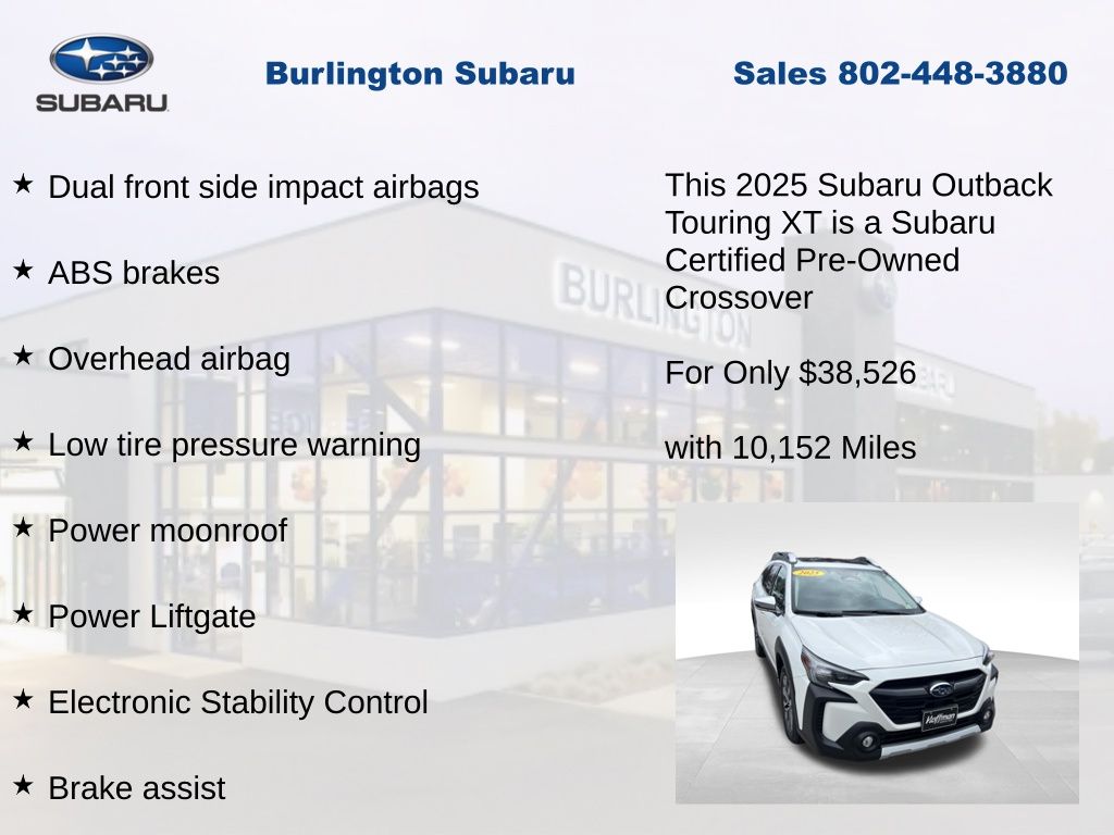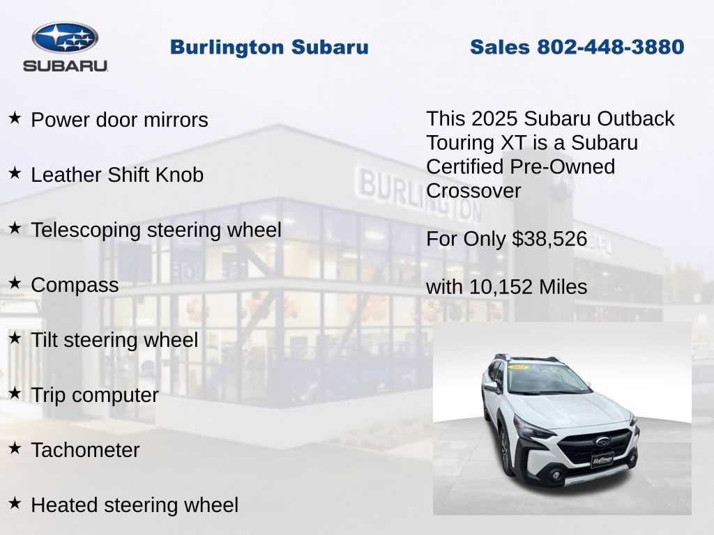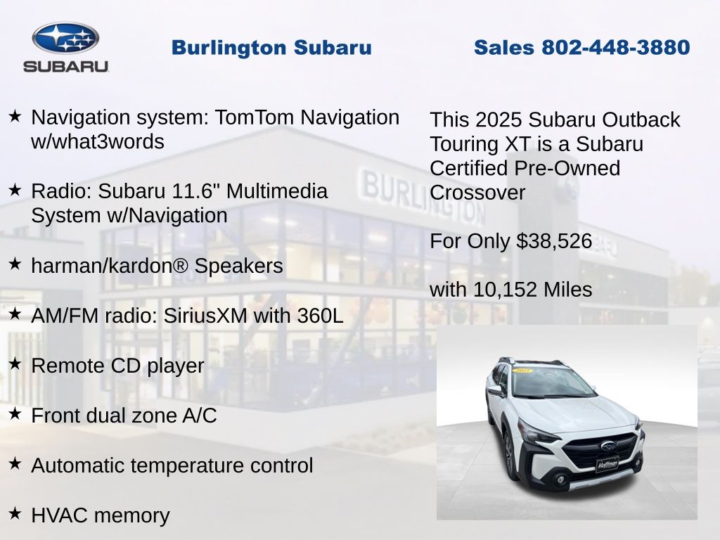 CARFAX One-Owner. Clean CARFAX. Subaru Outback Touring XT 2025 Certified. 4-Wheel Disc Brakes, ABS brakes, Air Conditioning, Alloy wheels, AM/FM radio: SiriusXM with 360L, Apple CarPlay & Android Auto, Auto High-beam Headlights, Auto-dimming Rear-View mirror, Automatic temperature control, Brake assist, Compass, Driver vanity mirror, Dual front impact airbags, Dual front side impact airbags, Electronic Stability Control, Emergency communication system: MySubaru Safety (3-year free trial), Exterior Parking Camera Rear, Four wheel independent suspension, Front dual zone A/C, Front fog lights, Front reading lights, Fully automatic headlights, Garage door transmitter: HomeLink, harman/kardon® Speakers, Heated & Ventilated Front Bucket Seats, Heated door mirrors, Heated steering wheel, HVAC memory, Illuminated entry, Knee airbag, Leather Shift Knob, Leather steering wheel, Low tire pressure warning, Memory seat, Navigation system: TomTom Navigation w/what3words, Occupant sensing airbag, Outside temperature display, Overhead airbag, Panic alarm, Passenger vanity mirror, Perforated Nappa Leather-Trimmed Upholstery, Power door mirrors, Power driver seat, Power Liftgate, Power moonroof, Power passenger seat, Power steering, Power windows, Radio: Subaru 11.6" Multimedia System w/Navigation, Rear window defroster, Rear window wiper, Remote CD player, Remote keyless entry, Speed control, Speed-sensing steering, Split folding rear seat, Steering wheel mounted audio controls, Tachometer, Telescoping steering wheel, Tilt steering wheel, Traction control, Trip computer, Turn signal indicator mirrors, Variably intermittent wipers, Ventilated front seats.